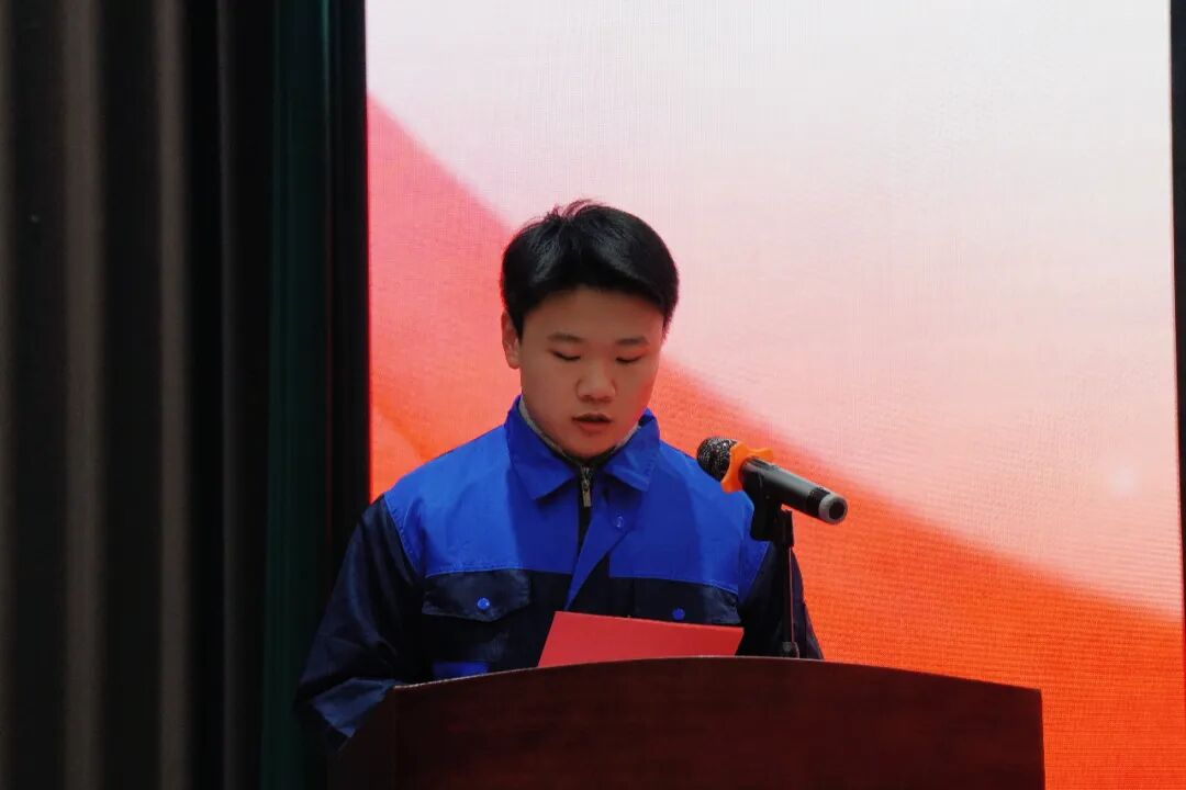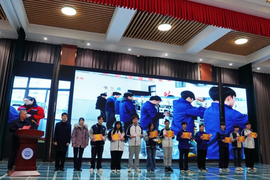 执行校长朱峰伟为获奖选手颁发获奖证书 中国银行南通港闸支行副行长管翼飞为获奖选手颁发奖品 伴随着激昂的乐曲,颁奖仪式率先拉开帷幕。获奖选手们依次登台,从颁奖嘉宾手中接过象征荣誉的证书和奖杯。他们脸上洋溢的笑容,不仅是对个人技能的肯定,更是对职业教育价值的认同。台下观众的掌声和欢呼声此起彼伏,现场洋溢着青春与奋斗的激情。 青春之声—获奖学生代表发言 智能装备系学生温师雨,他用朴实而真挚的语言分享了自己的参赛经历和感悟。“通过这次比赛,我深刻体会到技能学习需要沉下心来,反复练习。每一次的操作、每一次的调试,都是对工匠精神的践行。”温师雨的话语引起了在场师生的共鸣。他表示,将继续精进技能,以此次比赛为新的起点,在专业道路上不断前行,为未来的职业发展奠定坚实基础。